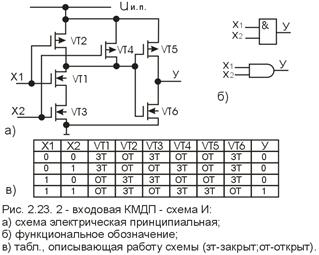 На рис. 1 приведены двухвходовые элементы ИЛИ-НЕ и И-НЕ положительной логики на KMДП. Рассмотрим подробнее работу элемента ИЛИ-НЕ.