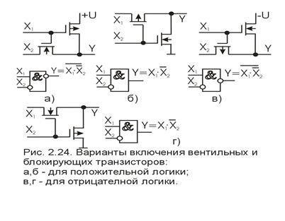 ЛЭ этой разновидности построены с учетом положительных вентильных свойств МДП-транзисторов. В каждом двуxвxoдoвoм ЛЭ с вентильным и блокирующим КМДП-транзисторами (КМДП с ВБ) имеется один собственно вентилирующий МДП-транзистор n-типа (или р-типа) и связанный с ним по затвору второй, блокирующий МДП-транзистор р-типа (n-типа). Объединенные затворы вентильного и блокирующего транзисторов (ВТ и БТ) во всех случаях являются одним из логических входов ЛЭ, сток ВТ — вторым логическим входом, а объединенные истоки ВТ и БТ — выходом ЛЭ. Роль ВТ может выполнять транзистор n- или р-типа, а БТ может быть подключен своим стоком либо к источнику питания, либо к общему проводу. Во всех вариантах включения ВТ и БТ выполняется функция И с запретом (НЕ, И) с инверсией или без инверсии по выходу.