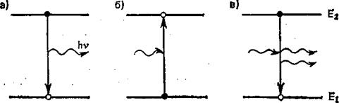 Излучение света может происходить двумя способами. Первый способ показан на рис. 2а. Когда электроны в атоме, находившиеся на энергетическом уровне E2 , без постороннего влияния переходят на более низкий энергетический уровень E1 , испустив световой квант, это спонтанное излучение. Если рядом находится атом, способный излучать свет с длиной волны, равной λ, или очень близкой к ней, то при поглощении этим атомом света с указанной длиной волны электрон переходит с уровня E1 на уровень E2 . Такое явление называют резонансным поглощением (рис. 2б). Второй способ: электроны находятся на уровне E2 и атом подвергается воздействию света с длиной волны, соответствующей резонансному поглощению. В этом случае атом испускает свет, по длине волны и фазе полностью соответствующий воздействию (рис. 2в). Такое явление называют вынужденным (индуцированным) излучением.