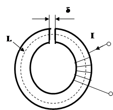 Пусть на кольцевом сердечнике, имеющем воздушный зазор δ, намотана катушка, содержащая w витков провода, по которым течет постоянный ток силой I. Определим магнитный поток в сердечнике, создаваемый этим током (см. рис. 2).