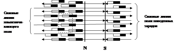 Если теперь в однородно намагниченном теле прорезать щель, то к одной грани щели окажутся выдвинуты северные, а к другой грани – южные полюсы элементарных магнитиков (см. рис. 3). Эти грани оказываются как бы заряженными зарядами разного знака, которые создадут магнитное поле как в щели, так и в самом теле.
