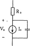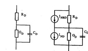 Эквивалентная схема малосигнальной модели диода приведена на рис..3а. Эта эквивалентная схема отличается от схемы, приведенной на рис. 1 тем, что в ней отсутствуют нелинейные элементы (генератор тока ID и элемент QD ), характеристики которых зависят от величины управляющего входного сигнала (напряжения) нелинейно. Использование эквивалентной схемы диода с линейными элементами, характеристики которых не зависят от амплитуды входного сигнала, существенно упрощает анализ ИС по переменному току.