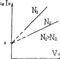 Коэффициент N позволяет учесть влияние на величину диффузионного тока в прямом включении диода процессов рекомбинации электронов и дырок, которые снижают ток IN (см. рис.2б). Если рекомбинацией пренебречь, то N=1, в противном случае 1 < N < 2.