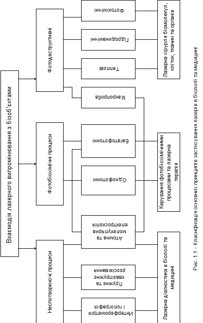 Використання лазерів у біології та медицині може здійснюватися в кількох напрямках, одним з яких можна вважати розробку на основі лазерної техніки приладів та методів для виявлення, ідентифікації, дослідження будови біологічних об’єктів, а також для вивчення природи процесів, що відбуваються в них [4].Застосування лазерів у біології і медицині засновано на використанні широкого кола явищ, пов'язаних із різноманітними проявами взаємодії світла з біологічними об'єктами. Лазерне випромінювання, так само як і звичайне світло, може відбиватися, поглинатися, розсіюватися, перевипромінюватися біологічним середовищем, і кожний із цих процесів несе інформацію про мікро- і макроструктуру цього середовища, рух і форму окремих його складових. Червоне, інфрачервоне (ІЧ) та ультрафіолетове (УФ) світло можуть надавати фотобіохімічну дію. Яскравими прикладами цього є фотосинтез рослин і бактерій, а також механізм зору. Високоінтенсивне світлове випромінювання ультрафіолетового (УФ), видимого червоного та інфрачервоного (ІЧ) діапазонів довжин хвиль робить руйнівну (деструктивну) дію на біологічні об'єкти. Необхідні інтенсивності можна створити і не тільки за допомогою лазерів [3,4]. Таким чином, процеси, що характеризують види взаємодій лазерного випромінювання з біооб'єктами, можна розділити на три групи. До першої відносять усі неспотворювальні взаємодії (принаймні, у межах похибок вимірів, що не здійснюють помітної дії на біооб'єкт), до другого - процеси, у яких виявляється фотохімічна дія, і до третього - процеси, що призводять до фотодеструкції. На рисунку 1 подана класифікація основних принципів застосування лазерів у біології і медицині, що враховує зазначені групи процесів.