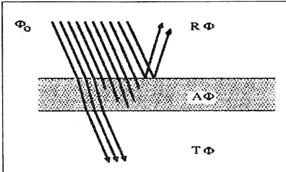 Рисунок 1.1 - Оптичні властивості прошарку матерії. Падаючий променевий потік розділяється на три частини: відбита частина Rф, поглинена частина Аф і пропущена частина Тф: Рф+Аф+Тф=1