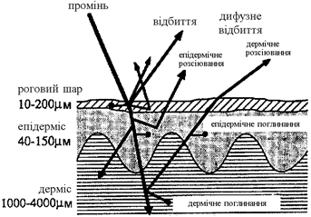 Рисунок 1.2 - Оптичні властивості лазерного променя на шкірі
