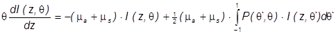 де I (z, q) – потужність випромінювання, що розповсюджується на глибині z через одиничний майданчик і в одиничному тілесному куті в напрямку, який складає з нормаллю до цього майданчика кут, конус якого рівний q, Вт×м-2 ×стер-1 ; mа тams – коефіцієнти поглинання і розсіювання, м-1 ; Р ((q', q) – фазова функція розсіювання, що описує вірогідність того, що світло розповсюджується в напрямку q.