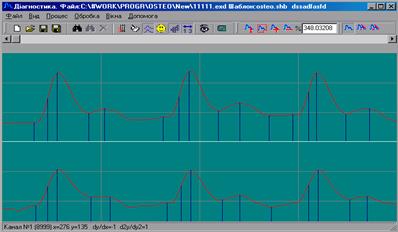 - відбувається пошук найближчого від початку буфера фрагмента A1 = {A1', де i=m...n} для якого А1'<>0 та у даному фрагменту визначається координата Хмах за величиною відліку А'(x) = max [A']. Якщо існує декілька розташованих поряд та рівних за величиною екстремальних відліків, тобто є у наявності горизонтальна "поличка" хвилі, відбувається обчислення ширини полички d та корекції координати Х на половину ширини полички Х1 = Х + d/2;
