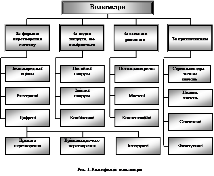 Величина напруги, що вимірюється в різних точках електричних кіл електрообладнання автомобіля, розглядається як діагностичний параметр. Для вимірювання напруги застосовуються вольтметри різних типів. Класифікація вольтметрів за різними ознаками наведена на рис. 1.