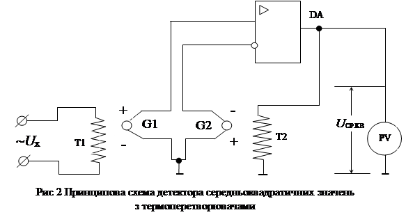 Напруга, що вимірюється, подається на нагрівальний елемент Т1 і через термопару G1 перетворюється в електричний сигнал постійного струму. Цей струм, пропорційний середньоквадратичному значенню напруги, що вимірюється. Другий термоперетворювач Т2, G2, включений у коло від’ємного зворотного зв’язку підсилювача DA, стабілізує процес вимірювання і лініарізує функцію перетворення. Поряд із простотою перетворення сигналу вольтметр такого типу має малий вхідний опір і значний час вимірювання tвим =1...3 с.