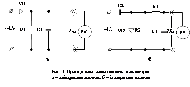 Пікові вольтметри мають пікові детектори з відкритим (рис.3, а) чи закритим (рис.3, б) входами. Піковий детектор містить однонапівперіодний випрямляч на діоді VD та інтегруючу ємність С1.