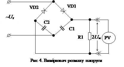 Інколи необхідно вимірювати розмах змінної напруги. Для цього використовуються вимірювачі розмаху (рис. 4).