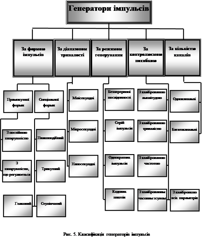 В універсальних вимірювальних генераторах передбачено оперативне регулювання і контроль параметрів сигналу. Генератори імпульсів широкого застосування класифікуються за декількома ознаками (рис. 5).