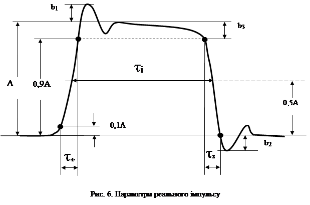Час-амплітудні параметри, якими регламентується реальний прямокутний імпульс, показані на рис. 6, де А – амплітуда; b1 ,b2 – викиди відповідно на вершині і зрізі; b3 – нерівномірність вершини; tі , tф , tз – тривалість відповідно імпульсу, фронту і зрізу.