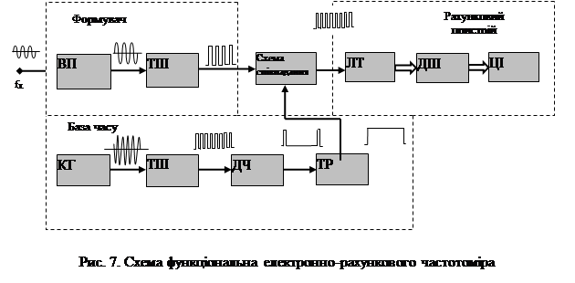 Найбільша перевага віддається електронно-рахунковим частотомірам, які можуть вимірювати на цифровому рівні частоту, період проходження імпульсів, відношення двох порівнюваних частот, кількість імпульсів за заданий період часу. Обов'язковими блоками цифрових частотомірів є формувач вимірюваного сигналу, база часу, що генерує часовий інтервал вимірювання; схема співпадання, що пропускає імпульси вимірюваної частоти за час вимі-