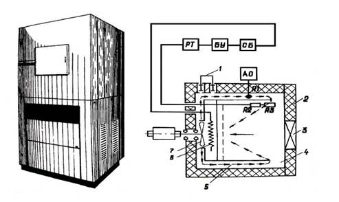 Рисунок 1 -Камера тепла КТ-0,05-315М: 1 - заслонка; 2 - дверь; 3 - окно; 4 - полезный объем; 5 - воздухопровод; 6 - нагреватель; 7 - вентилятор. РТ - регулятор температуры; БТ - блок управления; СБ - силовой блок; АО - блок аварийного отключения.