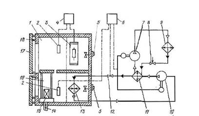 1 - камера тепла; 2 - датчики температуры; 3 - электронагреватель; 4 - регулятор температуры камеры тепла; 5 - осевой вентилятор; 6 - регулятор температуры камеры холода; 7 - компрессор верхней ступени холодильного агрегата; 8 - регулирующий вентиль; 9 - компрессор нижней ступени холодильного агрегата; 10 - КВСХО(7); 11 - теплообменник; 12 - регулирующий вентиль;13 - испаритель холодильного агрегата; 14 - устройство перемещения изделия из камеры в камеру; 15 - изделие; 16 - камера холода; 17 - дверь; 18 - уплотнение.