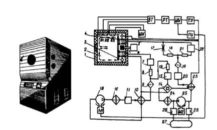 1 - дверь; 2 - полезный объем; 3 - нагреватель; 4,6 - испарители; 5 - вентилятор; 7 - терморегулирующий вентиль; 8 - соленоидный клапан; 9,20 - фильтры; 10,14,26 - теплообменники; 11,23 - вентили;12 - конденсатор теплотехнический; 13,22 - компрессоры; 15 - конденсатор-испаритель; 16,25 -термовентили; 17,19,21,24 - соленоидные вентили; 18 - дюза; 27 - емкость. ЗТ - задатчик температуры; РТ - регулятор температуры; УУ - устройство управления; ТР - тиристорный регулятор; ПУ - пусковое устройство; УМ - уравновешенный мост.
