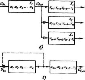 Возможны следующие случаи отсоединения вспомогательных элементов: исключение последовательных цепей (рис. 7, а); исключение параллельных ветвей (рис. 7, б); устранение разветвления (рис. 7, в); использование принципа обхода (рис. 7, г ).