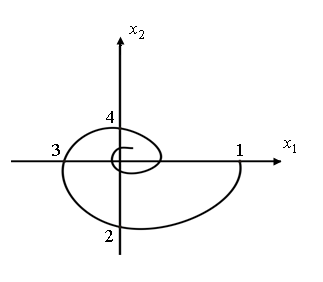 (0) =0, и на фазовой плоскости она расположена на отрицательной части горизонтальной оси и т.д. В результате для затухающего колебательного процесса фазовая траектория имеет вид сходящейся спирали.