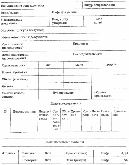 В табл.1 приведен бланк АД-1, который используется для общей характеристики документа. В графе "Приоритет" указывается, после каких или перед какими документами появляется описываемый, какие документы отменяет или заменяет. В графе "Метод подготовки (использования)" указывают, готовится ли документ путем расчета показателей, сбором сведений от источников информации и т.п., а его использование - для принятия управляющих решений, подготовки других документов и пр. В графе "Последовательность" указывается порядок следования сведений в данном документе. Все количественные характеристики, перечень которых может быть при необходимости изменен или дополнен, указываются при малых разбросах значений только в графе "среднее", а при больших разбросах заполняются все три графы "мин", "макс" и "среднее". В графе "Частота" приводится периодичность выдачи или получения документа - ежедневно, раз в месяц и т.п. Степень использования содержащихся в документе данных приводится в процентах от общего количества их в данном документе, В графе "Дублирование" приводятся наименования или шифры документов и информационных массивов, в которых имеются сведения, повторяющие содержащиеся в данном документе. Если образец документа прилагается, желательно, чтобы он был заполнен обычным образом. Цель использования указывается кратко по существу: подготовка отчета, расчет заявки и т.п. В последующих графах от "Обработки" до "Ссылка на" проставляется "крестик" или "галочка", если должностное лицо выполняет соответствующую операцию со всем документом или некоторыми данными из него.