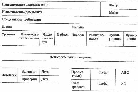 Второй бланк анализа документов АД-2 (табл.2) предназначен для детального описания документа. Как указывалось, его заполнение целесообразно для тех документов, вероятность сохранения в системе которых достаточно велика. Наименования подразделения и документа должны совпадать с указанными на бланке АД-1. Под специальными требованиями понимается цвет бумаги, особый формат, недопустимость помарок и исправлений и т.п. Уровень и шаблон элемента документа определяют аналогично принятому в КОБОЛе описанию данных. Высший уровень 01 присваивается тем элементам документа, которые не являются составной частью никакого другого элемента, напримершапка документа и его текстовая часть. Уровень 02 имеют элементы, непосредственно входящие составной частью в элемент уровня 01, уровень 03 - входящие в уровень 02, и т.д.