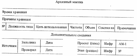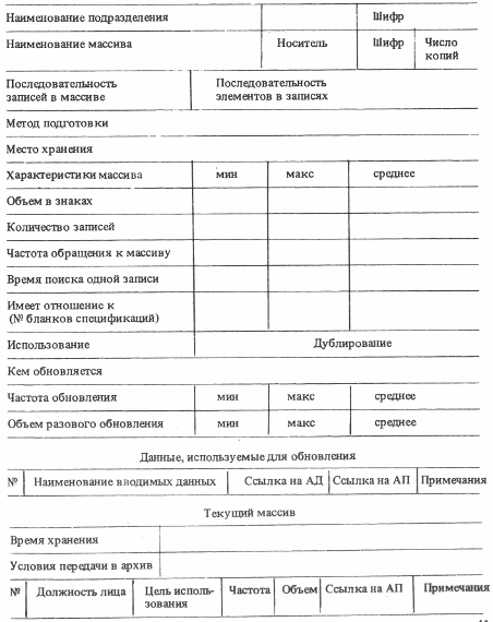 Для описания и анализа информационных массивов также используют два вида бланков - для укрупненного описания бланк АМ-1 и для детального - АМ-2 (табл.3 и 4). В графах "Последовательность записей" и "Последовательность элементов" указывается индекс, по которому располагаются последовательные записи в массиве или элементы в записи. Графа "Имеет отношение к" должна содержать перечень шифров бланков, в которых описаны данные и процедуры их обработки, необходимые как для формирования, так и для использования описываемого массива. Заполнение остальных граф аналогично описанному выше.