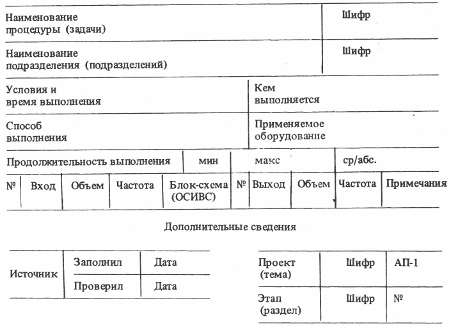 Для записи сведений об алгоритмах решаемых задач обработки данных укрупненно используют бланк АП-1 (табл.5) и подробно - бланк АП-2 (не приводится). На бланке АП-1 указывается, что является исходной информацией для решения задачи или процедуры обработки данных; используемые при выполнении процедуры массивы; получаемая выходная информация. В центральной части приводится схема алгоритма или СИВС решения задачи, если она не приводилась раньше в виде самостоятельного бланка. В соответствии с этой схемой составляется бланк АД-2, на котором детально описываются отдельные операции типа: ввод, сортировка, выборка, сравнение, вычисление, контроль, передача, вывод. Для каждой операции указывается ее смысловое содержание, например сортировка по видам продукции, вычисление среднего значения и т.п.; приводятся сведения о частоте выполнения операции, ее продолжительности, трудозатратах и др.