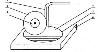 На рисунке 1 показана схема резки полупроводниковой пластины диском с наружной алмазной режущей кромкой. Диск 1 устанавливается на шпинделе станка и зажимается с двух сторон фланцами 2. В процессе резания алмазный режущий диск вращается с большой скоростью и охлаждается жидкостью 3. Разрезаемую полупроводниковую пластину 4 закрепляют клеящей мастикой 5 на основание 6.