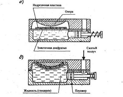Рисунок 3. Схема пневмогидравлической ломки полупроводниковых пластин М сферических (цилиндрических) опорах: