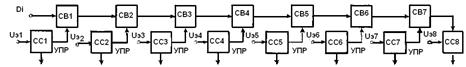 Перевод найденных амплитуд Dв цифровой код выполняется кодером, структура которого показана на рис. 1.1. Схема содержит 8 каскадов, т.к. ИКМ-30 использует восьмиразрядное кодирование.