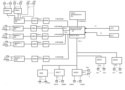 Узел управления mnпредназначен для управления работой станции и коммутационногооборудования, а также для осуществления контроля за станцией, а при необходимости, и для внесения изменений в структуру самой станции. Представляет собой сервер IBM-PC, где в качестве операционной системы применяется система реального времени, например, Windows-NT. Для связи с центральной станцией применяется локальная сетъ Ethernet. Узел коммутации SN на базе коммутационной платы МСА. Выполняет услуги адресации и физического соединения между потоками данных. К узлу коммутации сходятся все узлы доступа (как местные, так и удаленные). Для подключения к узлам доступа используется интерфейсная плата ТРС, рассчитанная на организацию связи 16-ти потоками ИКМ-30. На схеме (рис. 4.1) ТРС показана только между выносами и станцией, т.к. именно для выносов выполняется расчет числа 30-ти канальных потоков данных. Для связи с выносами используем 2 платы ТРС, в общей сумме рассчитанных на 2*16=32 потока ИКМ-30, из которых мы используем только 5*5 =25 потоков ИКМ (5-ть выносов по 5-ть потоков на каждый). Остальные 7 потока остаются в резерве.