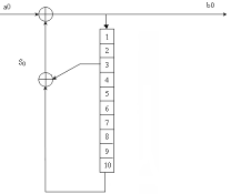 Т.к. число ячеек равно 10, то номера ячеек, которые будут использоваться для организации обратной связи такие: 3,10 .Построим структуру скремблера, учитывая, что тип скремблера по условию является скремблером с самосинхронизацией. При этом нечетные ячейки примут состояние логической 1, а четные - логического 0.
