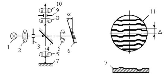 Свет от источника 1 проходит через конденсор 2 и диафрагму 3. Зеркало 4 делит его на два когерентных пучка, один из которых фокусируется объективом 5 на эталонное зеркало 6, а другой объективом 5' на контролируемую поверхность 7. После отражения от эталона и изделия пучки проходят через те же элементы схемы и фокусируются линзой 8 в плоскости диафрагмы 9, в которой с помощью окуляра 10 наблюдают интерференционную картину 11 взаимодействия эталонного и рабочего пучков света. При этом наблюдают чередующиеся светлые и тёмные полосы интерференции, искривлённые в соответствии с профилем исследуемой поверхности. Кривизну полос измеряют, например, с помощью окуляр-микрометра. Она является количественной характеристикой микронеоднородностей поверхности изделия: искривление на одно расстояние между одноцветными полосками соответствует глубине или высоте дефекта, равной одному периоду световых колебаний или в линейном размере - длине волны используемого света.