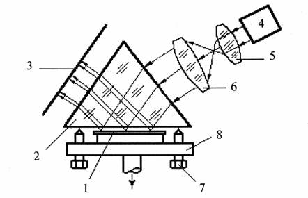 1 - полупроводниковая пластина; 2 - стеклянная призма; 3 - экран (матовое стекло); 4 - лазер; 5,6 - коллиматор; 7 - регулировочный винт; 8 - вакуумный прижимной столик