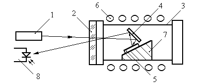 1 - лазер; 2 - оптическое окно; 3 - трубчатый реактор; 4 - зеркало; 5 - пластина; 6 - ВЧ-индуктор; 7 - графитовый нагреватель; 8 – фотоприёмник