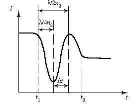 Это лежит в основе принципа действия лазерного интерференционного прибора для контроля толщины диэлектрических плёнок в процессе их нанесения (рис. 6). Суммарный оптический сигнал после интерференции этих лучей в процессе роста плёнки будет иметь осциллирующую форму (рис.7). Этот сигнал регистрируется и преобразуется в электрический с помощью фотоприёмника. Процесс наращивания диэлектрического слоя контролируют по зависимости I=f(t), которая регистрируется либо самописцем, либо графическим дисплеем с памятью. Толщине наносимой плёнки, соответствующей расстоянию между двумя экстремальными точками экспериментальной зависимости I=f(t), будет соответствовать разность хода лучей I1 и I2 , на которой укладывается половина длины волны используемого монохроматического излучения. Отсчитывая временной интервал от начала процесса и зная длину волны источника излучения и показатель преломления n2 , по кривой I=f(t) можно регистрировать текущее значение толщины наносимой на подложку плёнки.