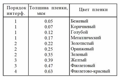 Ощущаемый глазом цветовой интервал соответствует в среднем 30 нм. Тогда для зелёного цвета (=550 нм) получимh/h=30/550=0.054, т.е. визуальный цветовой метод контроля толщины может иметь относительное разрешение по толщине порядка 5 %.