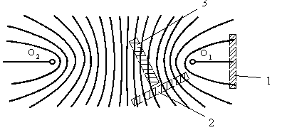 При встрече опорной и предметной волн в пространстве образуется система стоячих волн, максимумы которых соответствуют зонам, где интерферирующие волны находятся в одной фазе, а минимумы - в противофазе. Для точечного опорного источника O2 и точечного предмета O1 поверхности максимумов и минимумов амплитуд световых колебаний представляют собой систему гиперболоидов вращения (рис. 2).