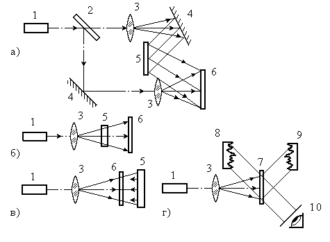 Рис. 9. Двулучевая (а), однолучевая (б) схемы голографирования и схема со встречными волнами (в); г - схема восстановления изображений;