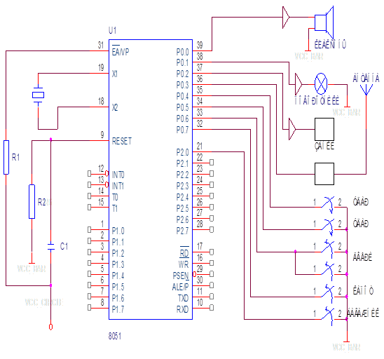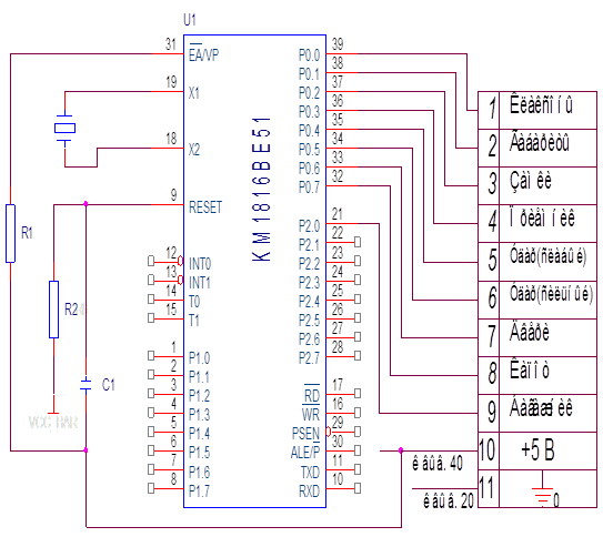 Схема контроллера представлена в приложении 1 кроме МК51 потребуется RC-цепь для формирования сигнала сброса при включении питания и кварцевый резонатор 12 МГц. Так как для хранения прикладной программы используется РПП, то на вход отключения РПП(ЕА) подается уровень 1.