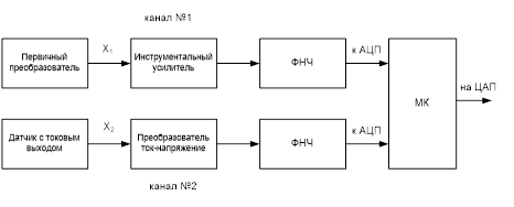 Автоматизация различных технологических процессов, эффективное управление различными агрегатами, машинами, механизмами требуют многочисленных измерений разнообразных физических величин. Для организации сбора данных с датчиков используется микроконтроллер, с помощью которого осуществляется контроль над технологическими процессами в производстве. Между датчиком и микроконтроллером обязательно должен присутствовать канал обработки данных, который осуществляет усиление, фильтрацию и нормирование сигнала, подавление синфазной помехи; производится нелинейная обработка сигнала с целью линеаризации характеристики датчика и приведение аналогового сигнала к виду, пригодному для ввода в аналого-цифровой преобразователь (АЦП). В ходе выполнения данного курсового проекта необходимо синтезировать устройство согласования первичного преобразователя (датчика) с микроконтроллером. В данном устройстве первым узлом является датчик, а АЦП является оконечным узлом проектируемого устройства, и все другие составные функциональные единицы прямо или косвенно обеспечивают его нормальное функционирование. Синтезируемое устройство содержит два параллельных канала передачи сигналов: датчик – усилитель – фильтр нижних частот – аналого-цифровой преобразователь.
