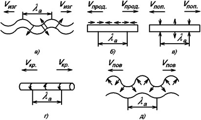 В механических фильтрах используются изгибные, продольные, крутильные, поперечные, сдвиговые и поверхностные (волны Рэлая и Лява) волны. Деформации волн и направления их распространения приведены на рис.1, где а) – изгибное, б) – продольное, в) – поперечное, г) – крутильное и д) – поверхностное колебания. Стрелками показаны деформации и направления распространения волны; λа – длина волны, которая определяется следующими скоростями распространения: vизг, vпр, vпоп, vкр, vпов. Эти скорости зависят от свойств материалов, в основном, от модуля упругости Е и плотности материала ρ. Скорости для каждого вида колебаний различны и могут отличаться в два раза.