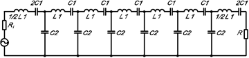 Пример приближенной эквивалентной схемы электромеханического фильтра приведен на рис.2, где L1 и C1 – эквивалентные параметры резонатора, а C2 – эквивалентные связи. Число звеньев и степень связи, полученные при электрическом расчете, реализуются при конструировании фильтра. При конструировании резонаторов необходимо определить их материал и геометрические размеры, а вид колебаний выбирается заранее.