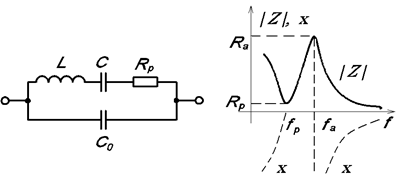 Схема замещения пьезоэлектрического резонатора, содержащая кроме С0 ветвь LCRр, отображающую действие резонатора, а также зависимость модуля сопротивления |Z|, полученную экспериментально с учетом потерь, и зависимость реактивного сопротивления х резонатора при отсутствии потерь приведены на рис.3. Частота fp соответствует частоте последовательного резонанса между индуктивностью L и емкостью С: fp=1/2π