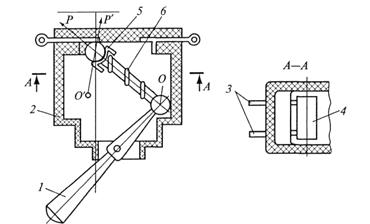 Из числа перекидных переключателей наиболее широкое применение получили тумблеры (рис.5) . Принцип работы тумблера состоит в следующем. При крайнем положении рычага 1 пружина 6 прижимает переключающий валик 4 к одной паре контактов 3, замыкая их. При перемещении рычага в другое крайнее положение пружина сжимается до тех пор, пока центр О головки рычага не окажется в положении О'. При этом под действием составляющей силы P ' валик перемещается к другой паре контактов и замыкает ее, а первая пара размыкается.