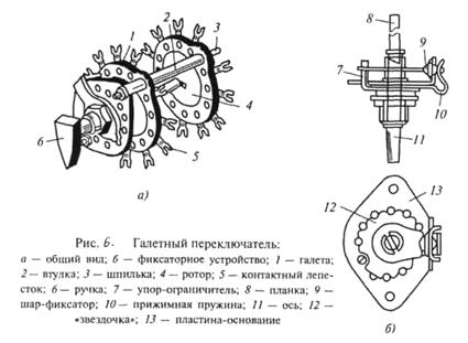 Галетные переключатели являются многополюсными, что позволяет одновременно осуществлять коммутацию нескольких функционально связанных цепей. Галетные переключатели широко применяются в радиоаппаратуре. Наиболее малогабаритными являются низкочастотный МПН-1 (рис.6, а) и высокочастотный МПВ-1 (рис.6, б) переключатели.