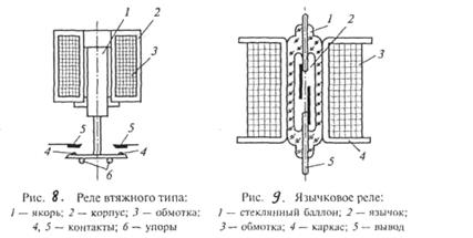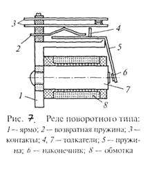 По конструктивному оформлению различают реле поворотного (рис.7), втяжного (рис.8) и язычкового (рис.9) типов.