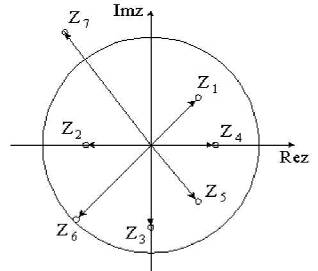 Тепер можна дати формулювання математичної умови стійкості: імпульсна автоматична система стійка, якщо всі корені її характеристичного рівняння (7) лежать усередині кола одиничного радіуса, побудованого на початку координат комплексної площини z (рис. 1, точки z1 ,, z2 ,,z3 , z4 , z5 ).
