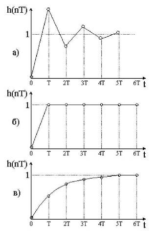Оцінюють показники якості перехідного процесу роблять за імпульсною перехідною функцією системи h(пТ) — реакції на одиничну східчасту дискретну функцію Хвх (пТ) — 1(пТ).